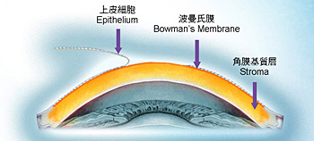 - 将薄层掀开/移除,再利用激光於角膜上皮下进行打磨。