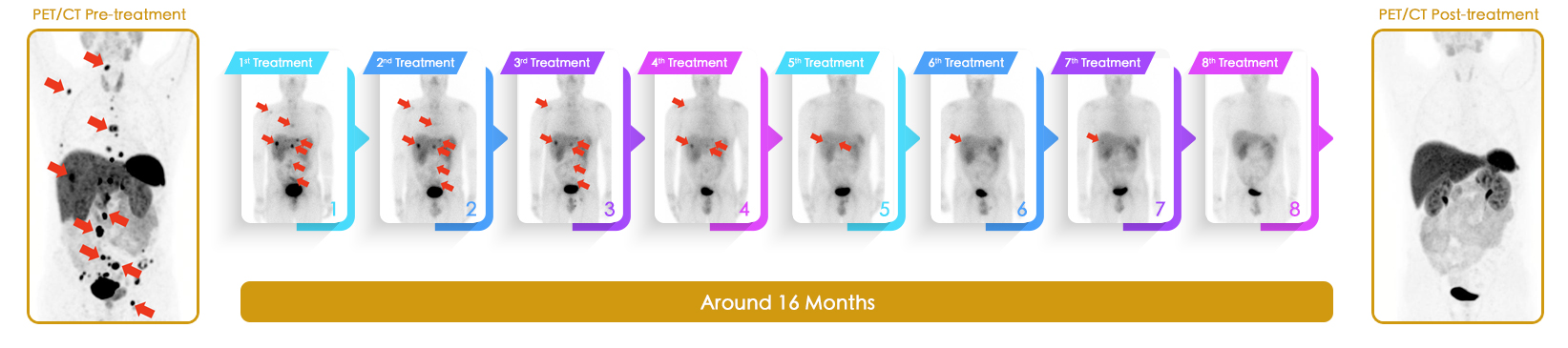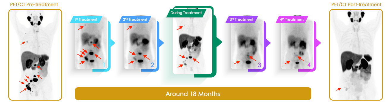 治疗後扫描显示病灶活跃度大大降低。