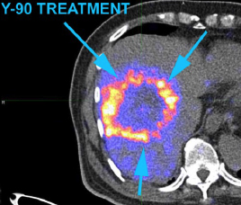 - 用正电子/电脑双融扫描显示钇90粒子分布(右)
