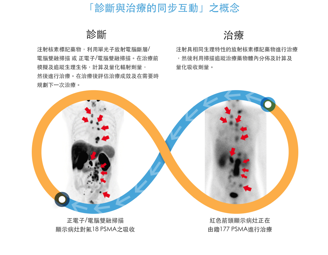 过程首先利用多样化诊断放射核素(如氟18丶碳11丶镓68丶鎝 99m及碘 123等)作断层扫描(正电子/电脑双融扫描及同位素单光子电脑断层扫描) 来判断癌症分期丶追踪扩散丶模拟治疗及预测效果;然後配合具相同生理特性的药物及释放治疗辐射的放射核素(如碘 131丶鑥 177丶钇 90丶镭 223及锶 89等),来达到集中治疗功效,并追踪体内分布。这些应用实践了现今於相同疾病中,对不同患者的个人化治疗计划。影像参数用作个人化治疗计划,当中包括评估治疗可行性,预测成效及负作用及减少不必要的反覆检查,以改善治後存活率及生活素质。
