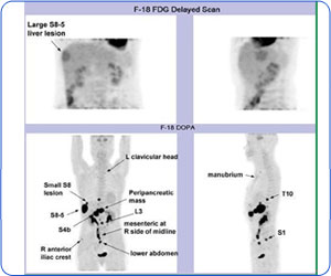 F-18 DOPA掃描顯示出多處神經內分泌瘤病灶。