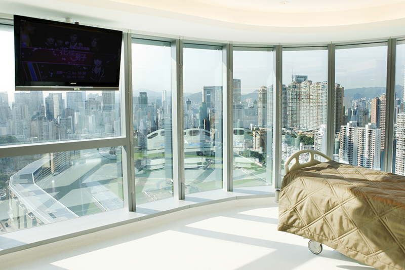本院33丶35丶36及37楼均设有私家房,地方宽敞。病室特设落地玻璃,环迥饱览跑马地开扬景观。自然光线映入眼帘,令室内更见柔和;两层式窗帘,既能阻挡阳光,亦无碍病人欣赏窗外景观,让病人在房里可以安心养病,轻松接受治疗。楼层特设特大等候区,以供访客使用。